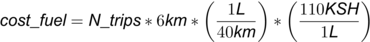 is the price paid per jerrycan at the source (as a weekly average). To calculate the weekly cost of fuel, we make a few assumptions. Respondents were unable to give an estimate of the number of kilometres or the number of minutes the average trip took, so we use the most frequent trip’s origin and destination as the length of the average trip (six kilometres for a return trip from a central staging location). We assume that the motorcycles used by the boda bodas have a fuel economy of 40 km/L of petrol. Average fuel prices during the study were 110 KSH/L.